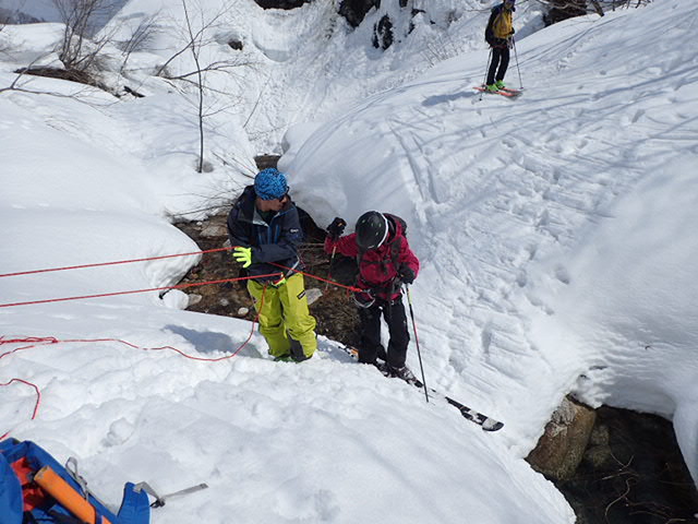 内容::バックカントリースキーで必要なロープワーク。たとえば板を装着したままの